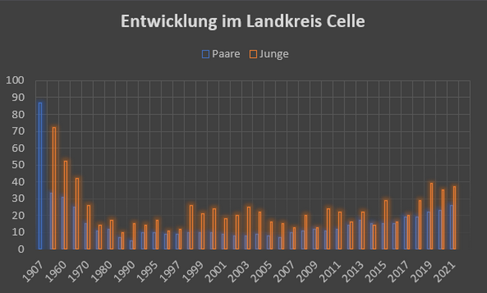 Auch 2021 erhöhte sich die Anzahl der Brutpaare. Mit 26 Paaren wurde die Anzahl aus dem Jahr 1967 erreicht. Schaut man auf das Diagramm, ist ein starker Anstieg in den letzten Jahren zu sehen. Woran liegt das?